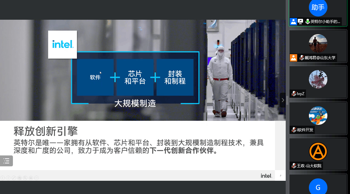 随后,蔺杰发表题为《oneAPI异构计算编程模式》的专题讲座,对意在解决异构编程挑战的英特尔oneAPI系列产品进行入门介绍。oneAPI是一种基于开放标准的,支持跨硬件、跨结构的统一编程模型和语言支持,使程序能够在很少的改动下运行在不同的环境中,提高生产性能。蔺杰从基础工具套件、DPC++编译器、DPC++库、VTune分析器等多角度向听众介绍了HPC工具套件的详细内容。同时,他聚焦知识领域,着重介绍了基于SYCL的编程语言DPC++的程序结构,从运行时编译机制等角度阐述了迭代空间、缓冲区和数据选择等概念,以及高级的ND-Range、group slice实现分组和SYCL异步执行等机制,清晰地说明了与硬件交互的流程和编码方式。