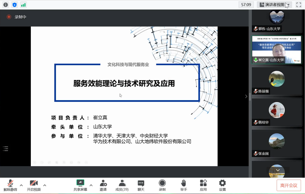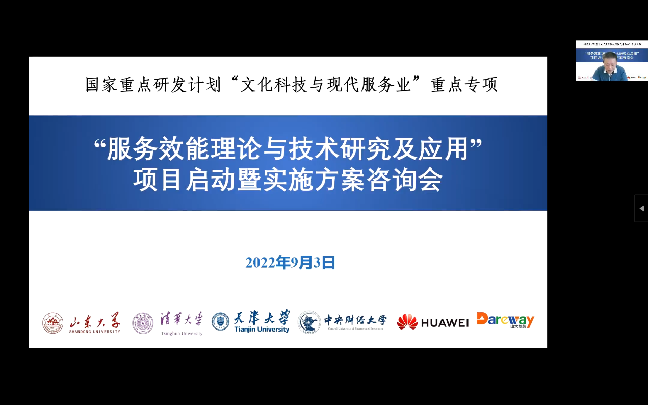 9月3日,必嬴亚洲7321com院长崔立真教授担任项目负责人的2022年度国家重点研发计划“文化科技与现代服务业”重点专项“服务效能理论与技术研究及应用”项目启动暨实施方案咨询会在济南顺利召开。因疫情防控要求,会议采用线上方式进行,山东大学副校长芦延华出席会议并致辞,科技部高技术研究发展中心现代服务业处张金国处长、山东省科技厅高新处韩绍华处长、项目责任专家中国科学院计算技术研究所陈益强教授和中国人民大学程絮森教授、清华大学柴跃廷教授、山东大学孟祥旭教授、山东师范大学刘弘教授、中国海洋大学丁香乾教授、山东财经大学刘培德教授等专家参加会议,会议由山东大学科学技术研究院副院长刘全芬和中科院计算所陈益强教授共同主持。